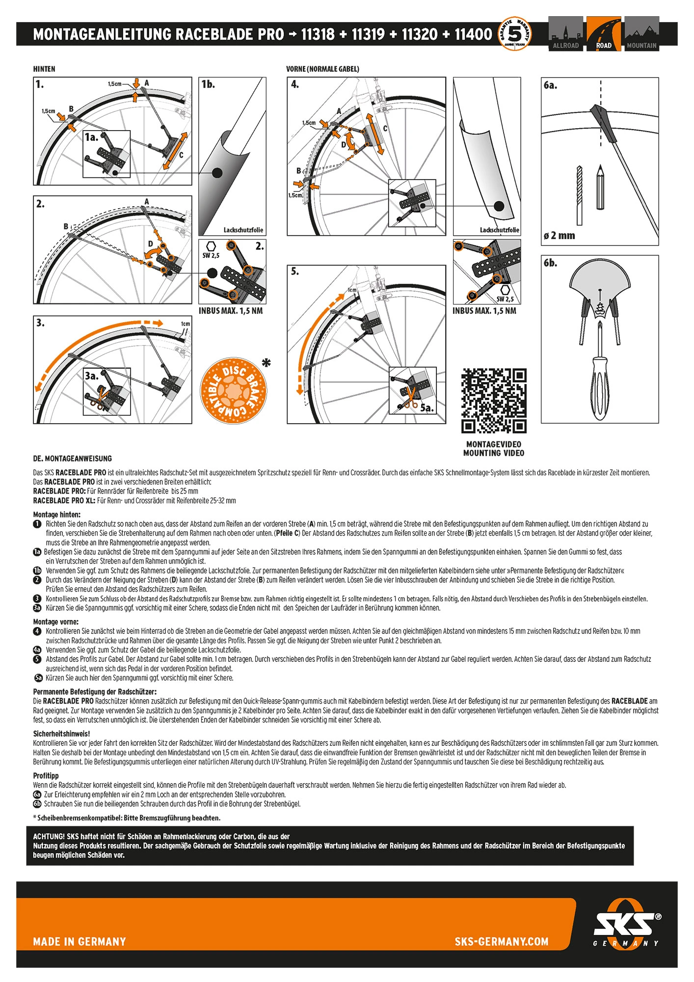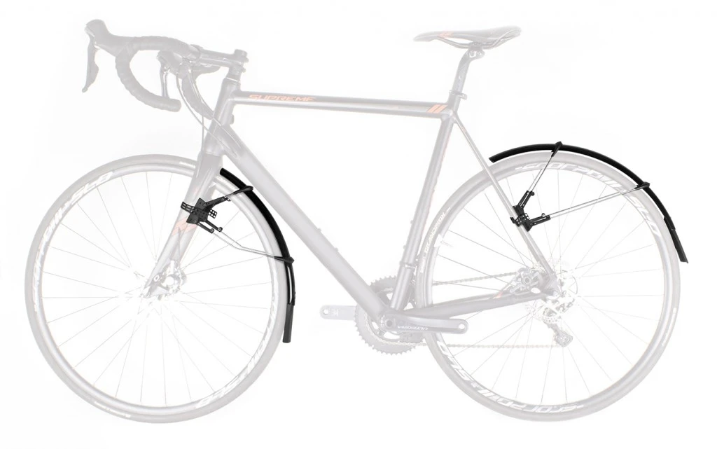Le système de fixation simple à deux articulations Quick-Release s’adapte également aux fourches aéro et aux freins à disque. Les garde-boue peuvent être parfaitement adaptés au rayon des pneus en réglant la longueur des entretoises. Le spoiler super léger et extra-long offre une protection supplémentaire contre les projections.