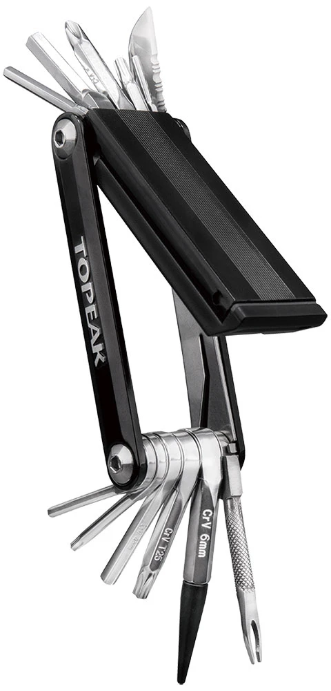 multitool Tubeless de précision Topeak de 18 pièces dans une forme fine en aluminium forgé. L’outil Tubeless et les bouchons qu’il contient sont logés dans le corps de l’outil pour un profil aussi plat que possible, ce qui le rend parfaitement adapté à toutes les réparations sur les vélos de course ou les VTT.