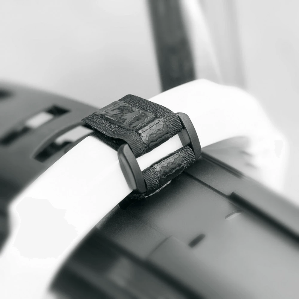 Grâce au pont VELOFLEXX, le garde-boue arrière peut être fixé sans outil en haut de la tige de selle à l’aide d’attaches en caoutchouc. Cette solution de montage ne dépend plus de la barre transversale sur laquelle est normalement fixé l’étrier de frein sur jante. À l’avant, le VELOFLEXX est fixé au té de fourche à l’aide d’une bande Velcro caoutchoutée ou d’un serre-câbles. Les adaptateurs de cadre rendent le montage possible sur n’importe quelle fourche et sont en outre réglables en angle. Les entretoises à revêtement noir assurent un maintien encore plus important.
