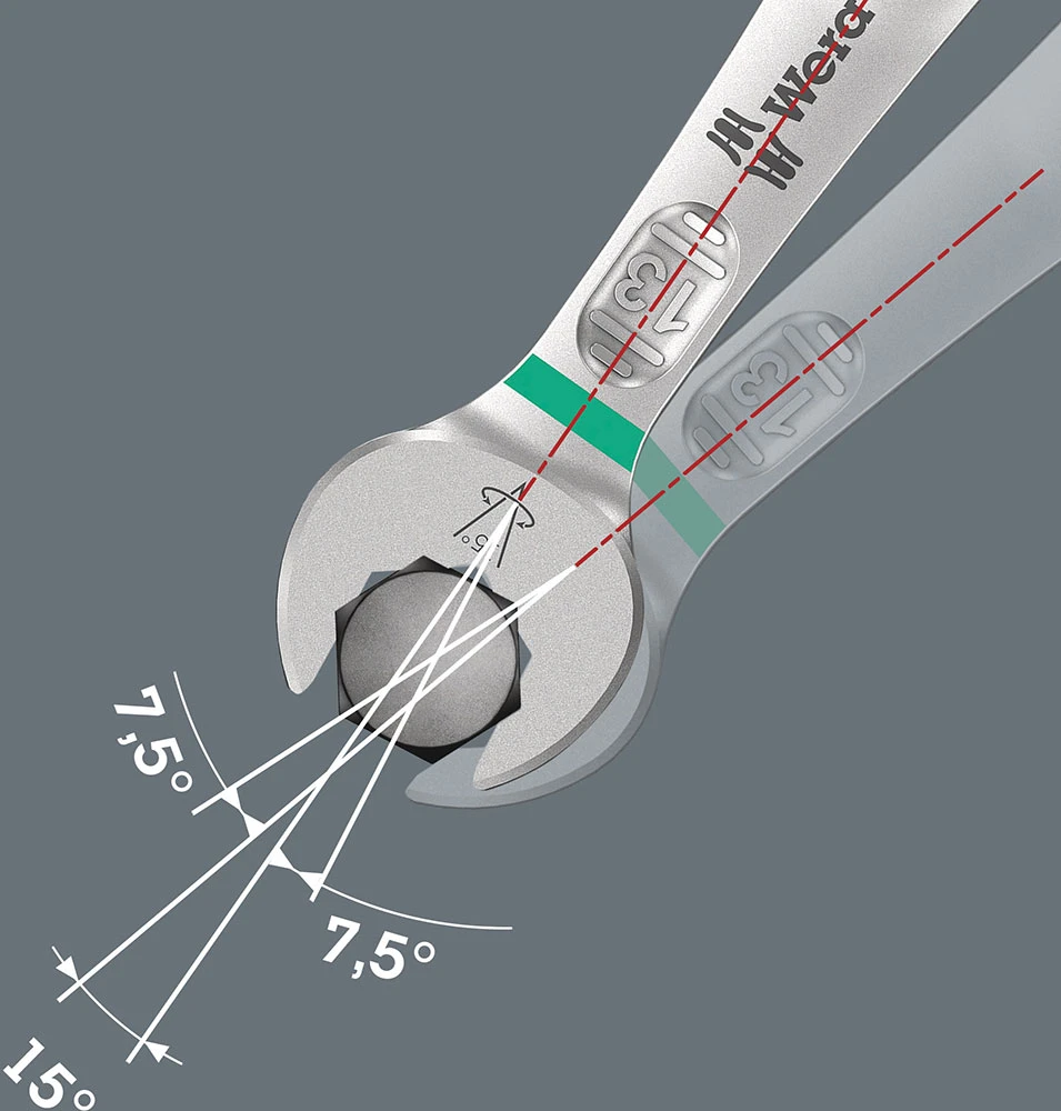 Le coudage à 7,5° du côté fourche, la forme dodécagonale et l’ajustement de l’utilisation (positionner, visser, tourner, positionner, visser, tourner, etc.) permettent de visser même dans des situations où l’angle de reprise ne peut pas excéder 30°.
