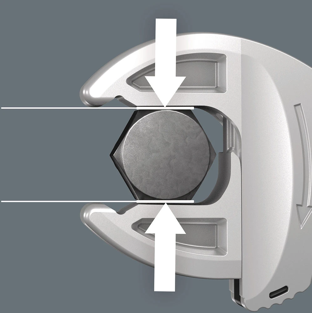 Les mors parallèles lisses du Joker6004 exercent une pression de surface et empêchent ainsi l’arrondissement de l’écrou ou de la tête de la vis susceptible de se produire lorsque la force est transmise par les angles.
